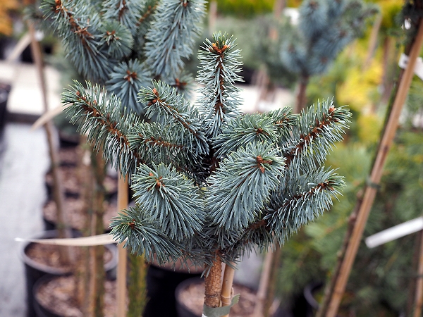 Materiał szczepiony 2-4 letni, na pniu o wys. 40-60 cm. Odmiana wolnorosnąca, pokrój gęsty i kulisty. Po 10 latach dorasta do ok. 0,7 m szer., roczny przyrost ok. 10 cm. Bardzo dekoracyjne falowane, ciemnozielone i długie igły. Letni przyrost ma kształt pędzelków o znacznie krótszych igłach.